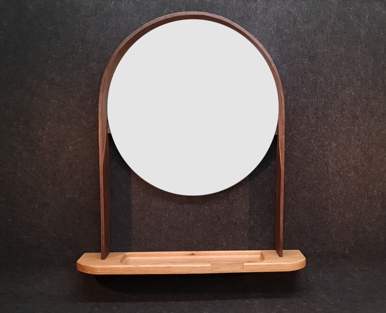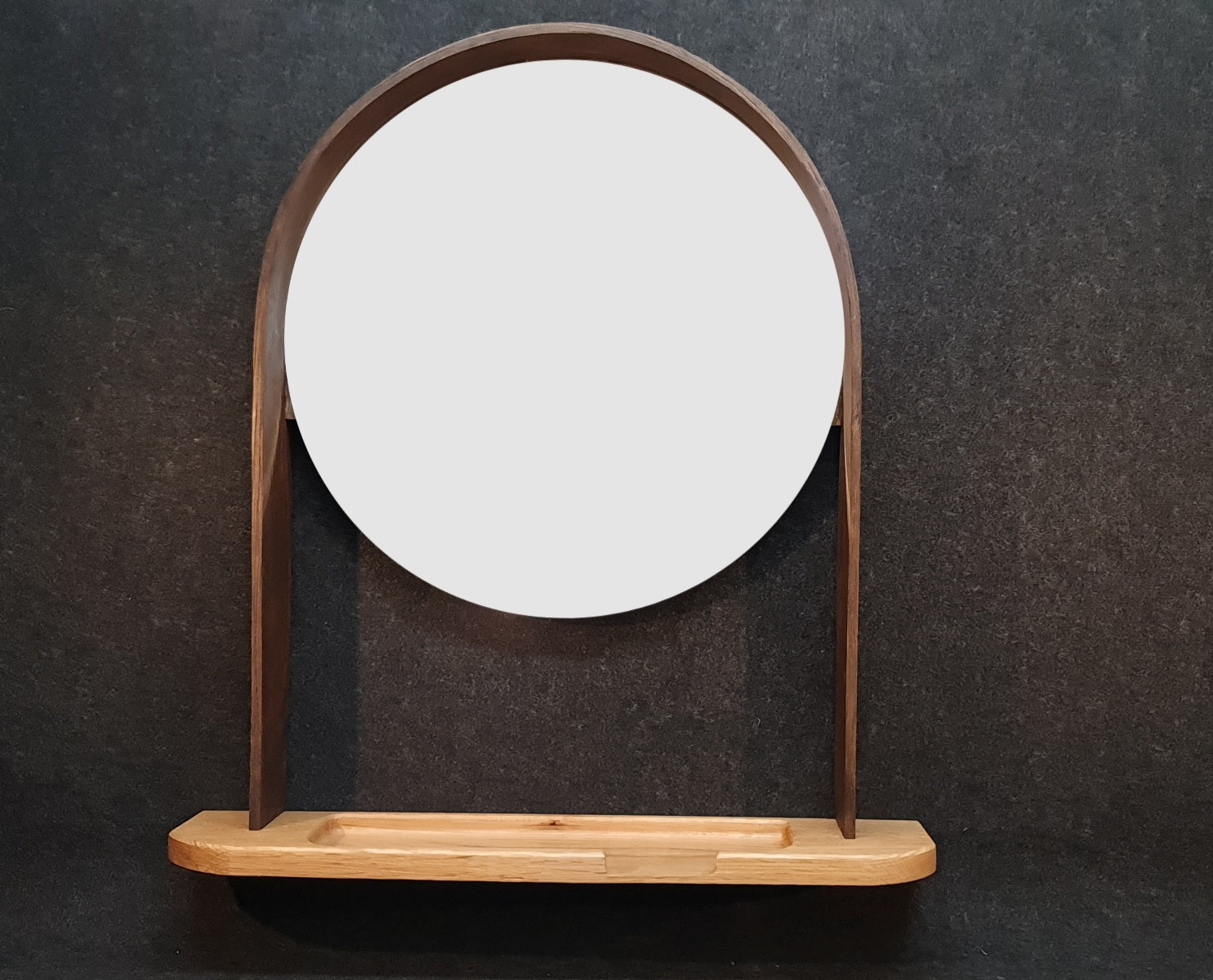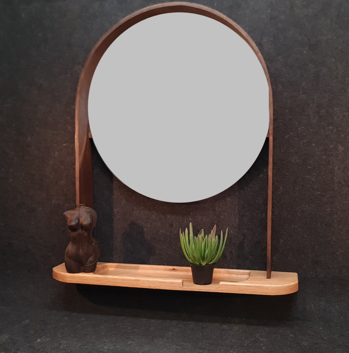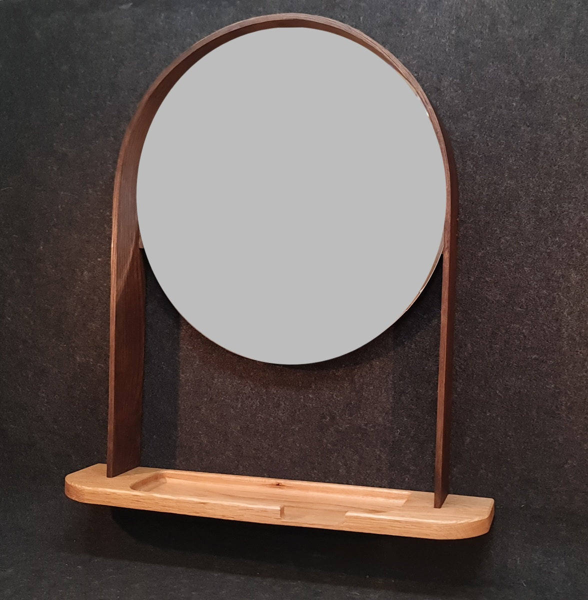 Denna spegel är tillverkad för hand i massiv ek och har en vackert betsad ram som framhäver träets naturliga karaktär. Ytan är behandlad med hårdvaxolja, vilket gör spegeln motståndskraftig mot fukt – perfekt för användning i såväl badrum som sovrum, hall eller vardagsrum.